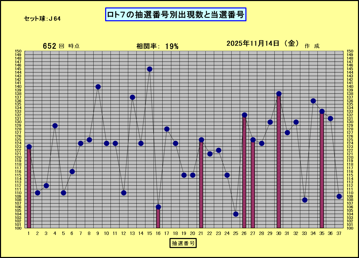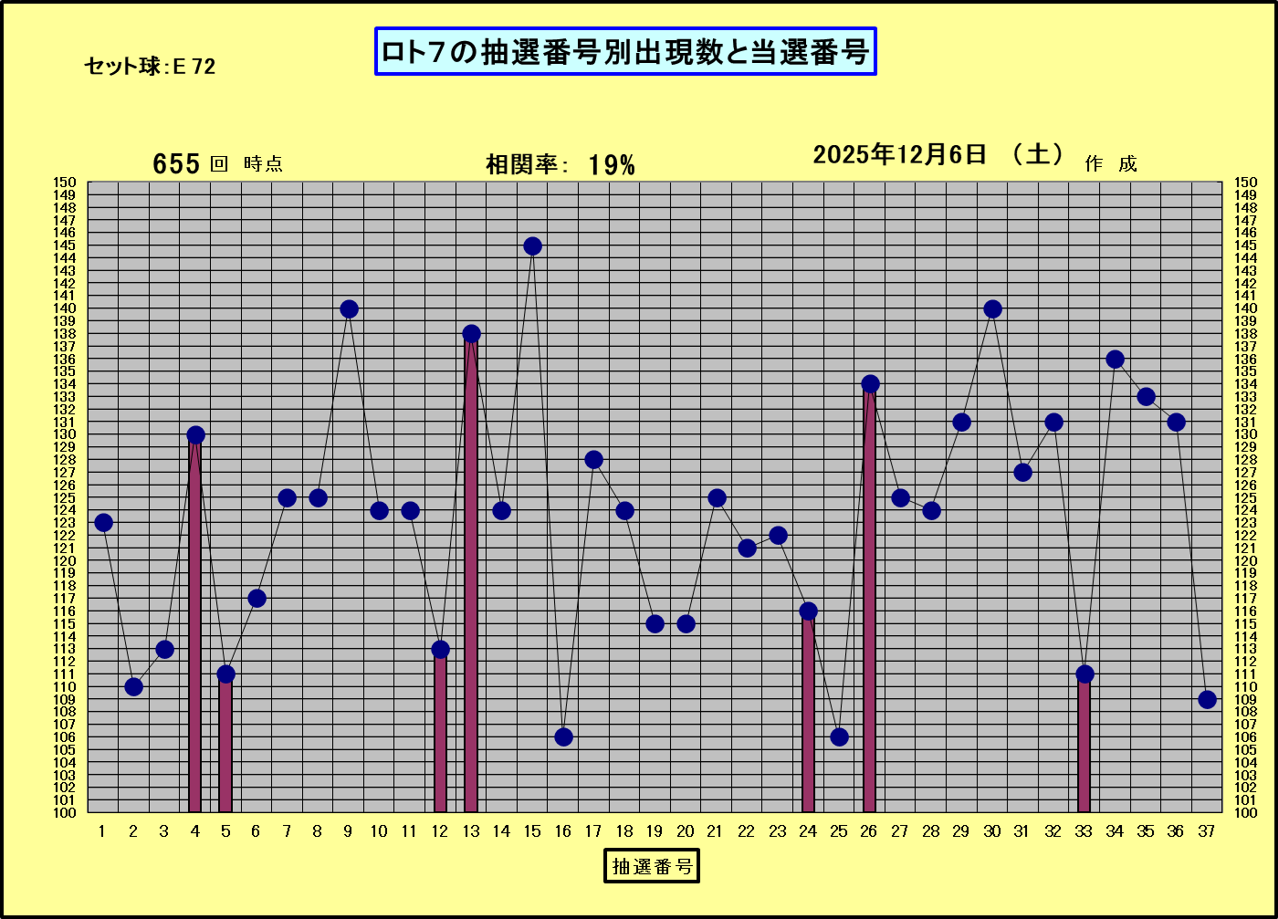 ◆ロト7の抽選番号別出現回数と当回の当選番号◆